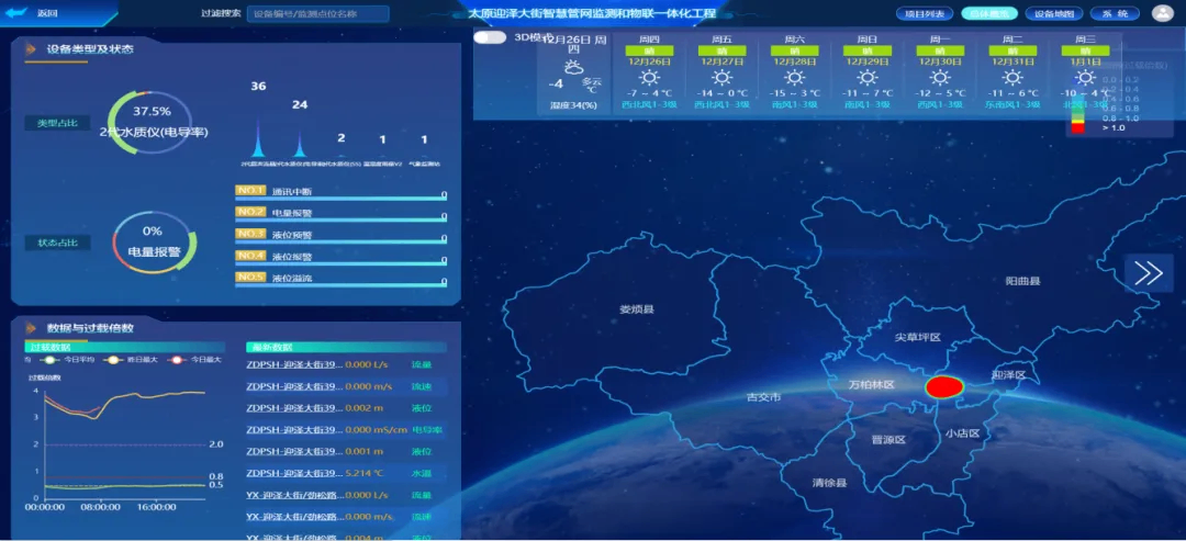 太原市城市排水生命線安全運(yùn)行監(jiān)測(cè)項(xiàng)目通過(guò)整合城區(qū)雨污水管網(wǎng)、泵站、污水廠、河道排口、重點(diǎn)排水戶、低洼積水點(diǎn)等相關(guān)數(shù)據(jù),接入泵站運(yùn)行數(shù)據(jù)、污水廠運(yùn)行數(shù)據(jù)、排污量、低洼積水點(diǎn)液位、泵站視頻、水雨情、氣象等信息,實(shí)現(xiàn)對(duì)全市雨污管網(wǎng)、泵站、污水廠及其他相關(guān)附屬設(shè)施的智能監(jiān)測(cè)管控,建成一個(gè)集信息共享、綜合運(yùn)行監(jiān)控、應(yīng)急處置、輔助決策分析于一體的多功能綜合管理平臺(tái),為排水業(yè)務(wù)管理、防澇指揮等提供支持,構(gòu)建“源網(wǎng)站廠河”一體化管理的新模式,形成具備實(shí)時(shí)感知、業(yè)務(wù)聯(lián)動(dòng)、預(yù)警預(yù)報(bào)、輔助決策和應(yīng)急調(diào)度功能的排水綜合管理體系。