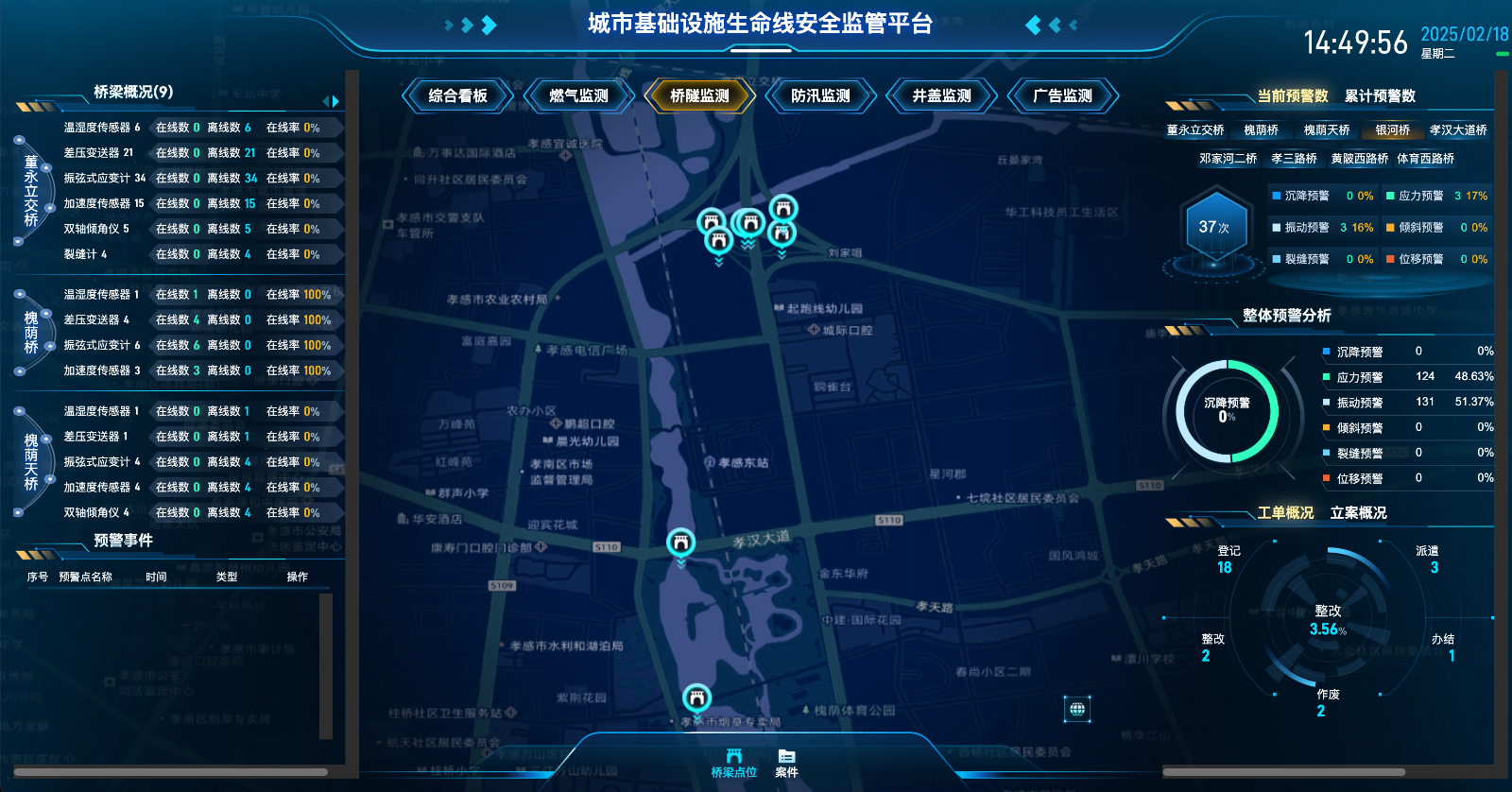 孝感市城市運(yùn)行管理服務(wù)平臺(以下簡稱“平臺”)是響應(yīng)住建部要求建設(shè)的標(biāo)桿項(xiàng)目,旨在通過物聯(lián)網(wǎng)、大數(shù)據(jù)、人工智能等技術(shù),實(shí)現(xiàn)城市生命線基礎(chǔ)設(shè)施的實(shí)時(shí)監(jiān)測與風(fēng)險(xiǎn)預(yù)警,提升城市安全運(yùn)行能力。平臺于2024年4月試運(yùn)行,同年7月通過預(yù)驗(yàn)收,其中橋梁安全監(jiān)測系統(tǒng)作為核心模塊,覆蓋主城區(qū)14座橋梁,形成“監(jiān)測—預(yù)警—處置—整改”閉環(huán)管理體系,顯著提升橋梁安全監(jiān)管效能。