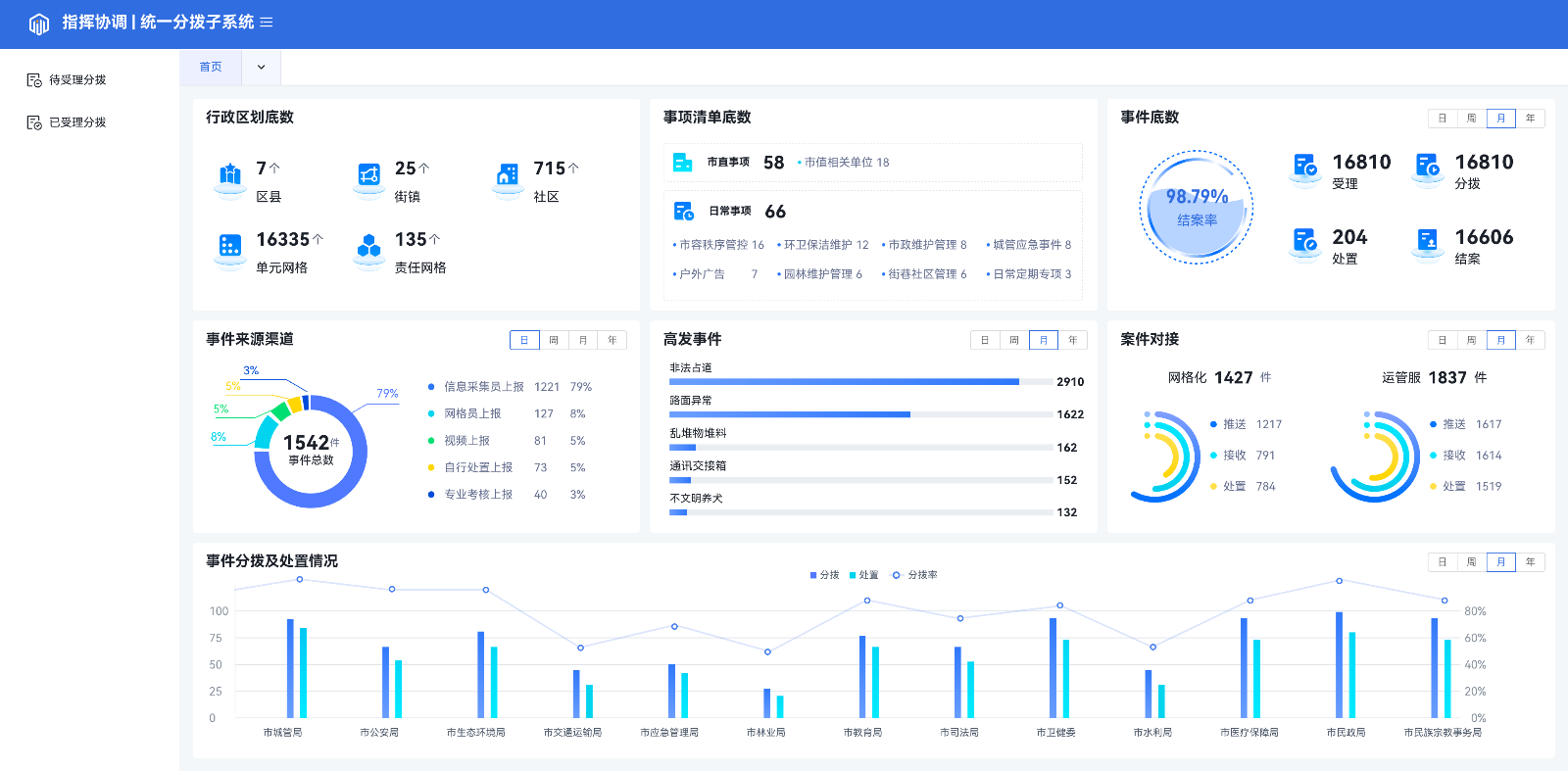 對(duì)接市政、園林、環(huán)衛(wèi)、執(zhí)法等業(yè)務(wù)部門已建信息化系統(tǒng)數(shù)據(jù),以“一張圖”對(duì)行業(yè)管理數(shù)據(jù)進(jìn)行綜合展示、運(yùn)行監(jiān)測(cè),提供城市綜合管理的指揮決策能力支撐。