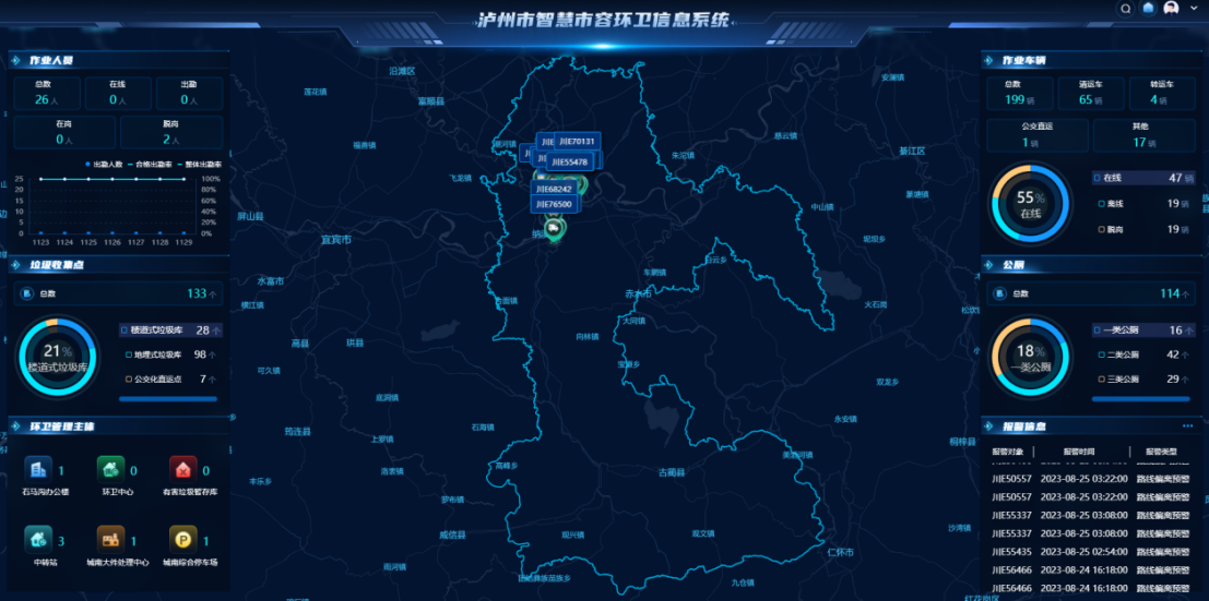 平臺(tái)對(duì)主城區(qū)多家環(huán)衛(wèi)服務(wù)企業(yè)、1000余名環(huán)衛(wèi)作業(yè)工人、70余臺(tái)作業(yè)車輛進(jìn)行科學(xué)智慧監(jiān)管,通過對(duì)環(huán)衛(wèi)企業(yè)、作業(yè)人員、車輛的規(guī)范化管理,做到智慧監(jiān)管有抓手,考核有數(shù)據(jù)管理、數(shù)據(jù)說話的新模式。通過智慧化技術(shù),環(huán)衛(wèi)企業(yè)的人員、車輛配置率提高到100%,建成區(qū)道路機(jī)械化清掃率達(dá)到92%,道路掃凈率達(dá)到95%,市容質(zhì)量提升了70%,政府資金投入使用率達(dá)100%。此外平臺(tái)對(duì)接了智慧廣告一體化平臺(tái)和瀘州市靜態(tài)交通可視化平臺(tái),實(shí)現(xiàn)戶外廣告和停車數(shù)據(jù)的信息化管理。