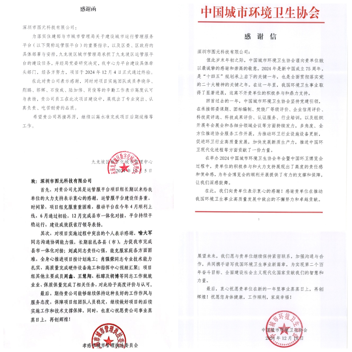 近期,圖元科技先后收獲了九龍坡區(qū)數(shù)字化城市管理中心、孝感市城市管理執(zhí)法委員會、中國城市環(huán)境衛(wèi)生協(xié)會發(fā)來的感謝信。這些信件旨在表彰圖元科技在城市管理領(lǐng)域所作出的貢獻(xiàn),對公司項(xiàng)目人員的專業(yè)水平及敬業(yè)態(tài)度給予高度認(rèn)可和表揚(yáng),肯定了圖元在過去一年的專業(yè)能力和高品質(zhì)服務(wù)。