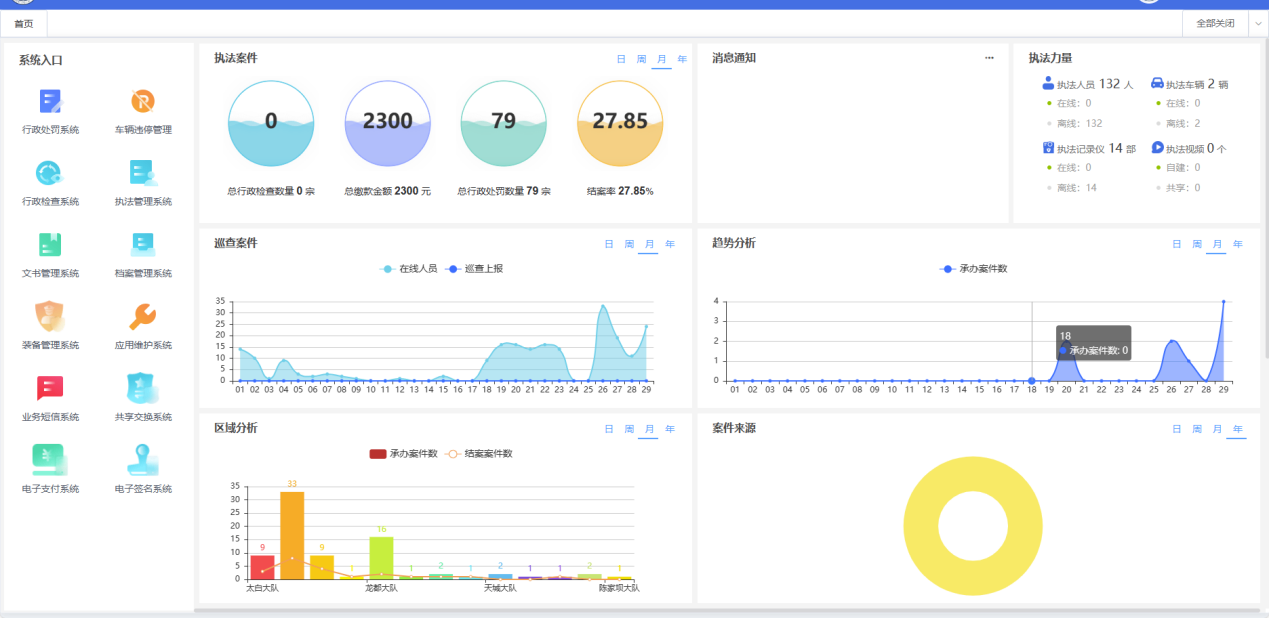 建設統一的綜合執法工作平臺,實現大屏、電腦和手機終端三屏融合,三屏融合充分利用現有的平臺和資源以執法主體用戶為核心在三屏之間形成很好的資訊互補和服務統一,從而推動彼此的價值提升。在不同網絡之間為執法者提供關聯匹配的業務,使執法管理者可以隨時隨地的享受到多終端融合的使用服務,為用戶帶來三屏的持續體驗。大屏側重于執法管理、運行監控、調度指揮、數據分析與展示;電腦屏側重于執法辦案、業務處理、協同工作和數據統計;移動端則采用全移動模式,實現執法辦案現場取證、案件批轉、指揮調度、數據分析、督查督辦等功能。